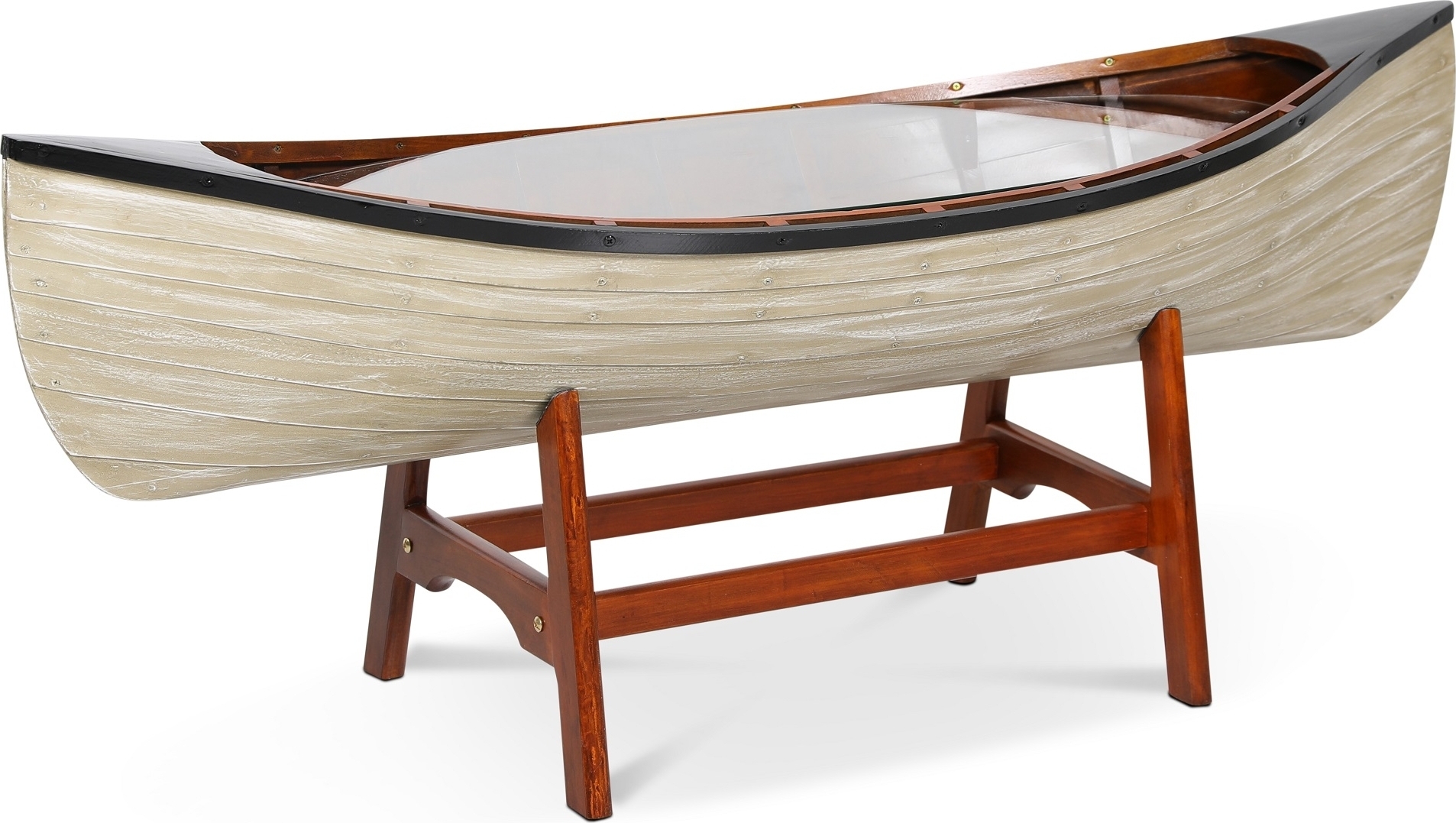 Notre série marine "Old Sailor" se compose de meubles et d'intérieurs dans un thème marin. Table basse en forme de bateau. Fabriqué en pin massif, peint comme un bateau classique. Plateau en verre.